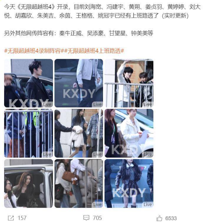 从传出的消息上看,《无限超越班4》已经开始录制,目前可以看到刘海宽、冯建宇、黄朔、姜贞羽、黄婷婷、刘大悦、胡嘉欣、朱美吉、余茵、王格格、姚冠宇等人,已经到录制地点。