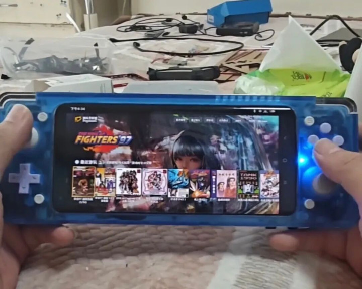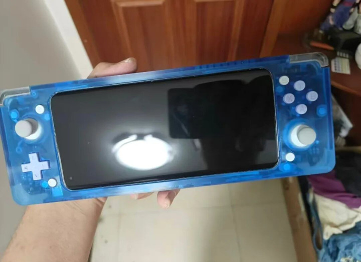 这个掌机中间直接嵌入了小米10手机的屏幕和主板,中框和背盖都拆掉了。这是小米在2020年2月发布的骁龙865手机,存储组合从8G+128G起步,屏幕是6.67英寸90Hz曲面屏,分辨率是2340x1080,用来改掌机可以通吃NS及以下的游戏,包括PSP、PS2、GBA等。
