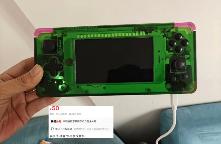 除了小米10改法外,大神还有用iPhone6改装的案例,从透明壳能看到iPhone6面板。其实像iPhone老手机更适合改掌机,因为6/6S/7/8都是4.7英寸屏,跟这个亚克力外壳都能对上,适配范围广。不过大神不卖成品掌机,只提供寄改服务,闲鱼标价50元。